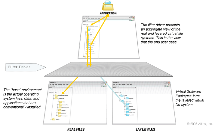 Altiris Software Virtualization Solution SVS aggregates the real and virtual file systems into one view for the end user.